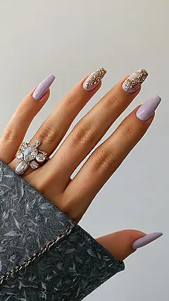 Check out these nails! They’re like a little lavender dream, all pretty and purple, with fancy gold details that look like they belong on a princess’s tiara (but way cooler). It’s like someone took a tiny, delicate flower and said, “Hey, let’s put YOU on a nail!” It’s totally Instagram-worthy, even if you’re just showing off to your friends at lunch. The color is seriously calming, like the perfect shade to match your mood when you’re totally zenning out after a tough math test.
