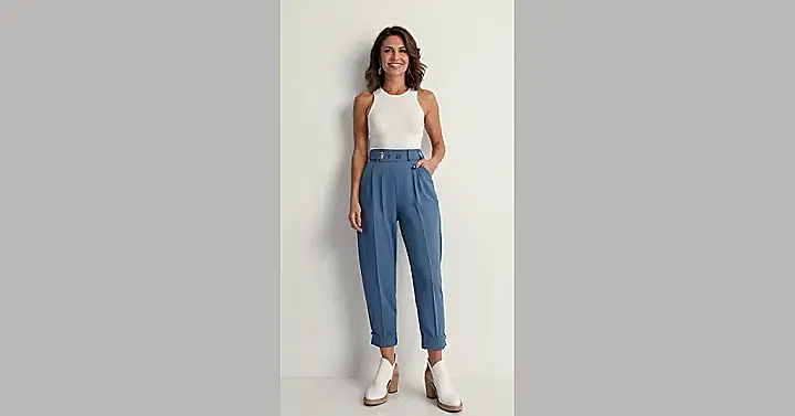 These aren’t your grandma’s pants, even if she’d probably rock them too! This is the elevated version of “casual mom pants” that says, “I can handle a PTA meeting, a grocery run, AND look amazing while doing it.” The bright blue color is super fun, and the whole outfit screams “put together” without looking like you spent hours getting ready. Plus, those sandals? Perfect for chasing after kids or just enjoying a sunny day.