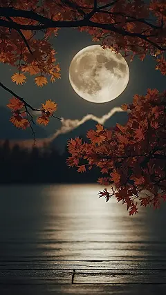 This picture is like a whisper from the night. It’s got a big, beautiful moon hanging in the sky, and the trees are all dressed up in their autumn best, with their leaves looking like they’re about to turn into little fireflies. It’s super calming, and makes you want to sit on that wooden deck and just watch the world go by. The picture reminds me of those minimalist wallpapers you see that are just a few simple shapes, but somehow they really make you feel something.