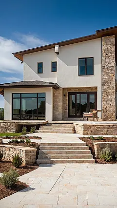 Peeking at this house exterior is like getting a sneak peek into someone’s cool life. Look at those giant windows! You could practically hold a whole school assembly behind one of them. And that stone detail isn’t just pretty, it looks like it could stand up to a dinosaur trying to lean on it. Plus, that big dark garage door? Definitely looks ready to hide a Batmobile or at least an impressive collection of bicycles. It’s got that solid, ‘come on in, but maybe wipe your feet’ vibe that makes you wonder what amazing things are happening inside.