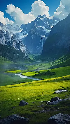 This image is like a page ripped straight out of a fantasy novel! Imagine a brave knight riding through this valley on a quest to find a hidden treasure. Maybe the river is full of magical fish, and the giant mountains hide a secret cave filled with sparkling gems. The whole scene looks like it’s waiting for some epic adventure to unfold!