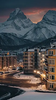 Imagine a city nestled snugly in a valley, surrounded by towering snow-capped mountains that look like giant, fluffy ice cream cones! The picture shows just that – buildings all lit up at night, casting a warm glow against the crisp winter backdrop. It’s like someone sprinkled fairy dust on the whole scene, making it look magical and cozy at the same time. Think of it as a winter wonderland where you can still grab a hot chocolate and maybe even see some skiers whizzing down the snowy slopes nearby.