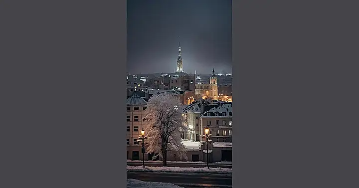 But the best part? Look at that icy river! It looks like a giant, sparkling mirror reflecting all the city lights and the snowy trees. It’s so pretty you almost expect Elsa from Frozen to skate by any minute! It’s a picture-perfect winter scene, so cozy and enchanting – making you want to grab a scarf and go explore this snowy city paradise.