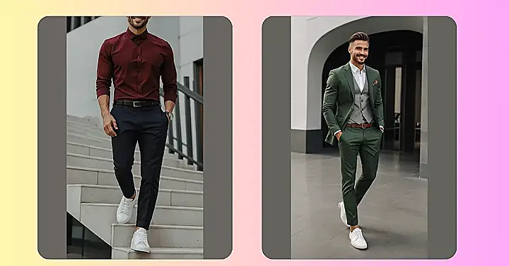 Check out this guy! He’s got the classic crisp white shirt and sharp navy pants, looking totally ready to handle some serious business. But wait, peek down at his feet – are those fresh white sneakers? Yep! This kind of outfit is like the superhero version of ‘men’s business outfits’ where you look polished and professional up top, but your feet are secretly ready for anything, maybe even a quick escape if the meeting gets boring.