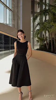 This picture shows a woman rocking a seriously chic black outfit! It’s like she walked straight out of a fashion magazine, but instead of a runway, she’s posing in a fancy lobby with some seriously impressive plants. Forget the boring old black dress; this jumpsuit is where it’s at! It’s got pockets (score!), a flattering shape, and it looks like it’s as comfy as your favorite pajamas, but way more sophisticated. Bet she’s ready for anything from a school dance to a fancy dinner.