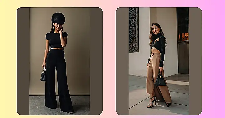 Hey there, fashion fans! Check out this super stylish outfit. It’s all about that amazing combo of classy black and super-chic camel. Imagine walking down the halls of your school rocking this look – you’d be turning heads faster than a runaway rollercoaster! The black crop top and those wide-legged camel pants are like a match made in fashion heaven. It’s sophisticated, but still totally you. Plus, that little black bag? It’s the perfect finishing touch for a day of conquering the world (or maybe just acing that math test!).