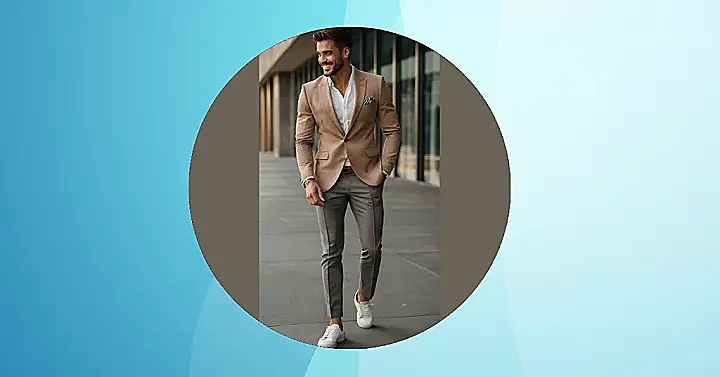 This guy’s outfit is like a perfectly brewed cup of joe – smooth, sophisticated, and totally satisfying! He’s rocking a beige blazer that’s as comfy as your favorite hoodie but way more impressive. The grey trousers are the perfect match, kind of like peanut butter and jelly, but way classier. And those crisp white sneakers? They’re the unexpected twist that proves a gentleman can be both stylish *and* comfortable. Forget stuffy suits, this look says, “I’m cool, confident, and ready to conquer the world – one stylish step at a time!”