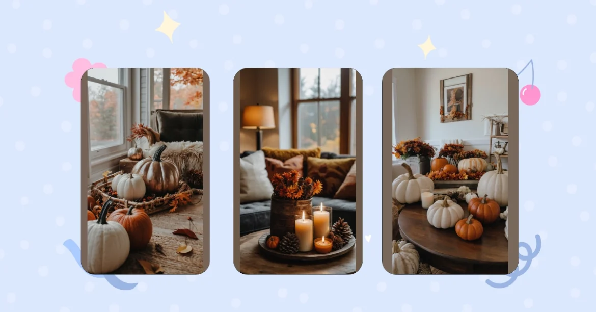 The whole scene is super chill, reminding you of those days when you can just hang out at home, watch a movie, and enjoy the cooler weather. You can see how a few simple elements like pumpkins and candles can totally transform a space and make it feel autumnal. Who needs fancy decorations when you can just grab some pumpkins from your backyard and let the cozy vibes flow?