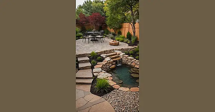 The fun doesn’t stop there, though! This patio isn’t just flat and boring; it’s got these cool stone steps leading down to what looks like a mini-oasis. There’s even a waterfall! It’s like a tiny, personal nature sound machine, perfect for when you need to zone out or just want to pretend you’re exploring some hidden jungle (minus the actual dangerous animals). Plus, all that lush greenery and the sturdy fence make it feel totally private and cozy. So, whether you’re planning a low-key hangout or just need a sweet spot to read a book and listen to the water trickle, this backyard patio design totally nails it.