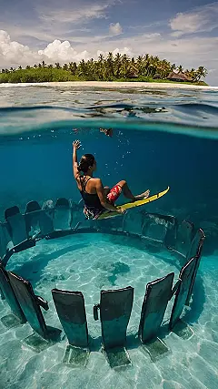 This Bali adventure is like something out of a movie! You get crystal clear water, a tropical island in the background, and a mysterious circle of seating beneath the waves. Forget your boring vacation pics – this is the kind of travel photography that’ll make everyone jealous and want to book a ticket to Bali pronto!
