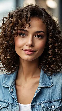 Now, the keyword throws in “with bangs,” which adds a whole new level to the curly hair game! While the wonderful curls in the picture are rocking it without any fringe action, imagine adding some curly bits right there on the forehead. Curly bangs are like tiny, fluffy question marks that frame your face, sometimes behaving like perfect little spirals, and other times deciding they want to explore space. They bring extra charm and a touch of playful chaos to the already fabulous world of natural curls, making every hair day an exciting surprise.