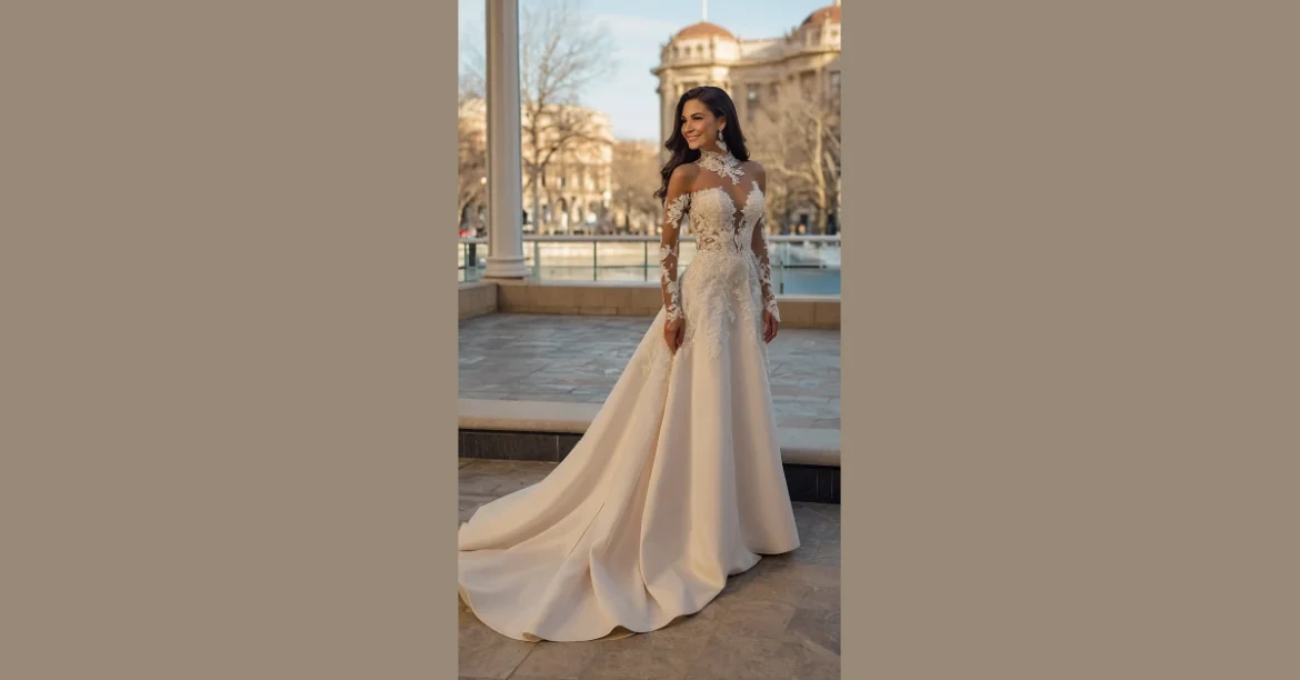 Forget those boring, plain wedding dresses; this one’s got personality! With those long sleeves and beautiful lace detail, it’s perfect for a bride who wants to look elegant but still have fun. Plus, who needs a tiara when you’ve got this stunning gown? This dress is basically a magic potion: it transforms you into the most radiant and confident version of yourself—ready to say “I do!” and live happily ever after.