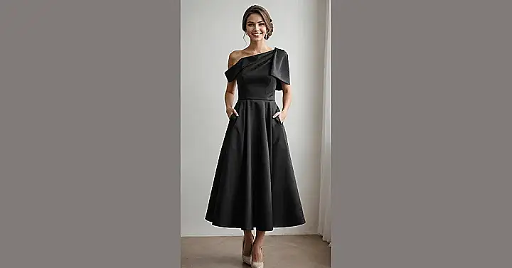 This sleek black number is screaming “fall wedding guest goals!” Just look at that cool one-shoulder detail and the way it flows – totally elegant without being over-the-top. It’s perfect for those crisp autumn evenings, keeping you looking stylish while you celebrate the happy couple. And let’s talk about the absolute game-changer here: pockets! No more awkward juggling of your phone, lip balm, and maybe a forgotten tissue during the emotional vows. This dress isn’t just pretty, it’s practically a life hack for wedding season.