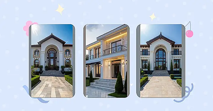 So, this villa is giving major “I’m rich, but also I like a good throwback” vibes! It’s got those big, fancy pillars like something out of ancient Rome, but they’re all sleek and white like someone just gave them a fresh coat of paint. The balcony is rocking some seriously cool metalwork. You can almost imagine a dramatic character gazing out from there, plotting their next move… or maybe just ordering pizza!