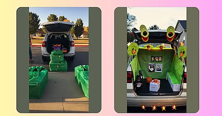 This picture shows a car all decked out for Trunk or Treat, and it looks like they’re ready for a serious candy giveaway! The trunk is piled high with treats, and the green boxes on the ground look like a fun, monster-themed way to hold even more candy. You can almost hear the kids shouting “Trick or Treat!” as they approach the candy mountain.
