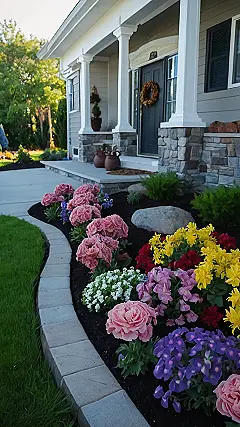 This picture is like a rainbow explosion in your front yard! The homeowner clearly loves flowers, and they’ve created a beautiful and colorful flower bed with a stone wall that looks like it was built by tiny giants. You can almost smell the sweet scents of all those beautiful blooms – it’s like walking through a fragrant garden!