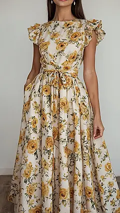 This long floral outfit is basically a walking ray of sunshine, ready to brighten up any day! With all those cheerful yellow roses, you might just feel like you’ve magically sprouted from a secret garden, or perhaps accidentally stolen a bouquet and decided to wear it. It’s the perfect blend of comfy and chic, making you look like you’re floating through life, utterly fabulous and ready for whatever fun comes your way, whether it’s a picnic or just chilling with friends. Just try not to smell *too* good, or the local bees might get confused!