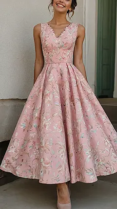This light pink floral dress is like a garden party exploded onto fabric! It’s totally dreamy—imagine twirling in it, feeling like a princess at a super stylish royal picnic. The flowers are so pretty they almost make you want to sniff the dress (don’t do that though, unless you’re sure it’s safe!). It’s the perfect outfit for showing off your best dance moves at any event where you want to look like a blooming, beautiful masterpiece.