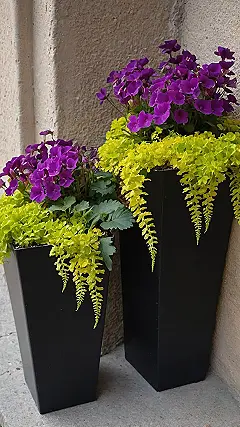 Check out these plants! They are seriously having a moment in those sleek black pots. The vibrant purple flowers are totally the main characters, stealing the show with their pops of color, while that lime green foliage trailing down is like their flashy sidekick, adding some serious drama. It’s like they got dressed up in their best outfits just to hang out by the wall looking fabulous for anyone who walks by.