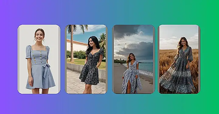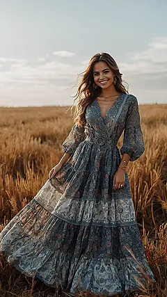 This girl is rocking a blue floral frock that’s totally giving off those dreamy, summer vibes. It looks like she’s standing in a field of golden wheat, and the sun is setting behind her, making her dress glow. She’s got the most beautiful smile, like she knows a secret that everyone else is missing.