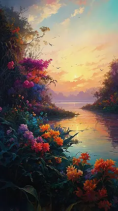 See all those colors popping off the canvas? It’s like the artist threw a rave for the paint tubes. The flowers are showing off their brightest outfits, the water is shimmering like it’s covered in glitter, and the sky is doing this whole dramatic sunset thing. You can almost hear the birds squawking, probably complaining that the sun is hogging all the spotlight. This oil painting background is so vibrant, you half expect the scene to just jump right out and give you a high-five made of pure awesome.