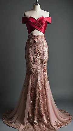 Let’s talk about wedding dresses, but forget the plain white ones your grandma wore (no offense, Grandma!). This dress is like the cool rebel of the bridal world, strutting in with a fiery red top that practically screams, “I’m here to party!” And then BAM! You hit the super pretty blush pink skirt, all covered in amazing embroidered flowers. It’s definitely not your typical, shy white gown; it’s more like a fashion-forward mermaid who decided to get married and needed something extra special to show off her personality.