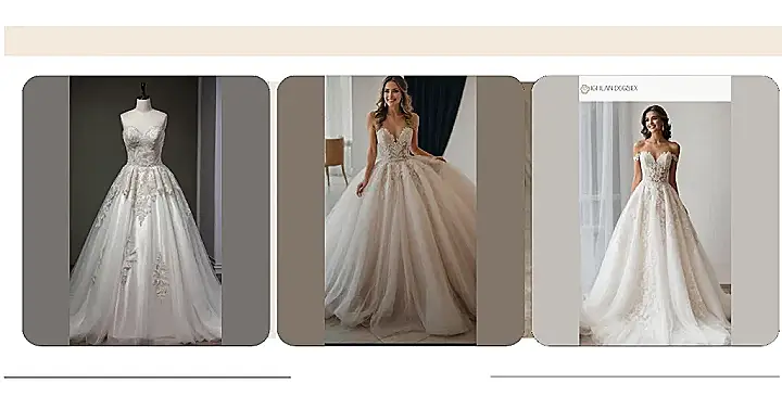 Just look at the amazing details on this gown! The intricate lace patterns really pop against that lovely, warm base color, making the whole dress a work of art from top to bottom. It’s like a floral wonderland, but make it fashion. Wearing a dress like this shows you’re not afraid to be yourself and stand out in the best possible way. Who needs boring when you can have a dress that’s this elegant, playful, and totally picture-perfect?