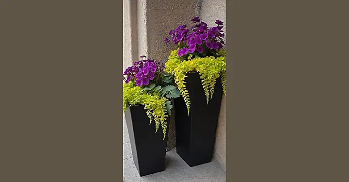 Check out these plants! They are seriously having a moment in those sleek black pots. The vibrant purple flowers are totally the main characters, stealing the show with their pops of color, while that lime green foliage trailing down is like their flashy sidekick, adding some serious drama. It’s like they got dressed up in their best outfits just to hang out by the wall looking fabulous for anyone who walks by.