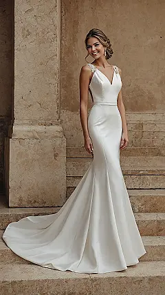 Wow, check out this dress! It’s so smooth and flowy, it looks like it was made from melted pearls or something. The way it hugs the body and then flows out into that dramatic train is seriously giving main character vibes. Plus, those little sparkly bits on the shoulders? Just enough bling to make you feel like royalty without looking like a walking disco ball. This is definitely the kind of dress that makes you want to stand up straight and maybe practice your queen wave, even if you’re just trying it on in a changing room that smells faintly of old carpet.