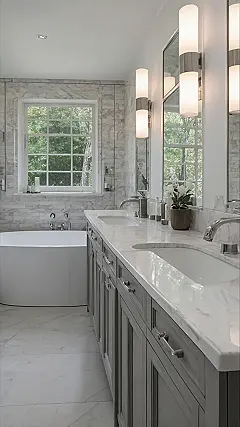 Stepping into a bathroom like this makes you wonder if your old shower curtain accidentally teleported to another dimension. This isn’t just a room; it’s a full-on glow-up, the kind of transformation that would make your jaw drop faster than a dropped bar of soap. Those sleek grey cabinets and sparkling marble countertops aren’t just for show; they’re like a command center for getting ready, especially with those dual sinks. No more awkwardly waiting your turn or elbowing someone for mirror space before school! And that deep, gleaming bathtub? It’s practically begging for a bubble bath and a break from homework, making every soak feel like a mini-vacation.