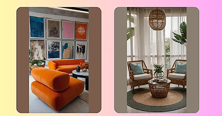 And seriously, the funk doesn’t stop there. That rug is pulling off geometric patterns like a boss, adding another layer of “wow” to the whole scene. There’s a big plant chilling in the corner, probably soaking up all the cool vibes. This is what happens when a living room decides it’s tired of being basic and wants to be a total showstopper instead. It proves that adding some unexpected colours and quirky furniture can turn any space into a seriously funky and fun hang-out spot that makes all your friends jealous.