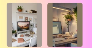 Look up at that wall of pictures – it’s like a cool, abstract party happening right above your head. With all those splashes of colour and wild shapes, it makes the room feel super artistic and definitely not basic. It’s the kind of place where you could totally crash with friends, admire the funky art, and maybe even get inspired to create some messy masterpieces of your own (just maybe not on the orange sofa!). This room screams personality and fun, which is basically the definition of funky.