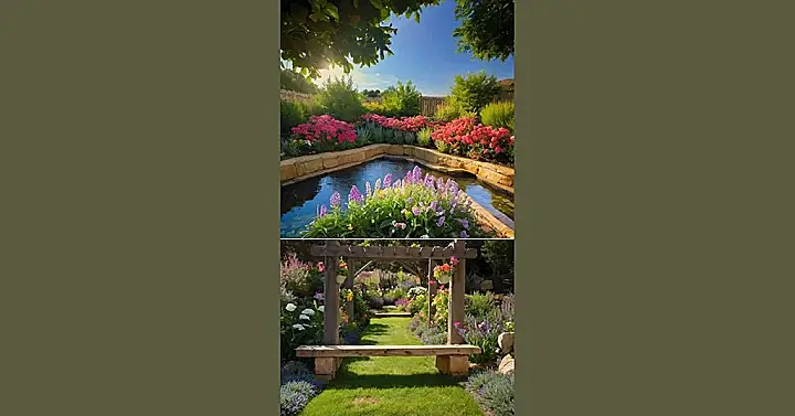 It’s not just a pretty face either, this garden’s got some serious landscaping skills going on. That perfectly round pond is like a secret oasis, surrounded by a vibrant explosion of colors. It’s the kind of place you could spend all afternoon just chilling, listening to the bees buzz, and appreciating nature’s amazing artwork. You could even add your own little touches to make it even more magical!