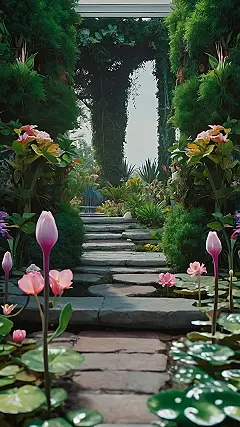This garden looks like a place straight out of a fairytale! Imagine yourself strolling along the stone path, surrounded by vibrant flowers and lush greenery. The soft sunlight filters through the trees, creating a magical atmosphere. You can practically hear the birds chirping and the bees buzzing. You might even catch a glimpse of a friendly fairy hiding among the blossoms!