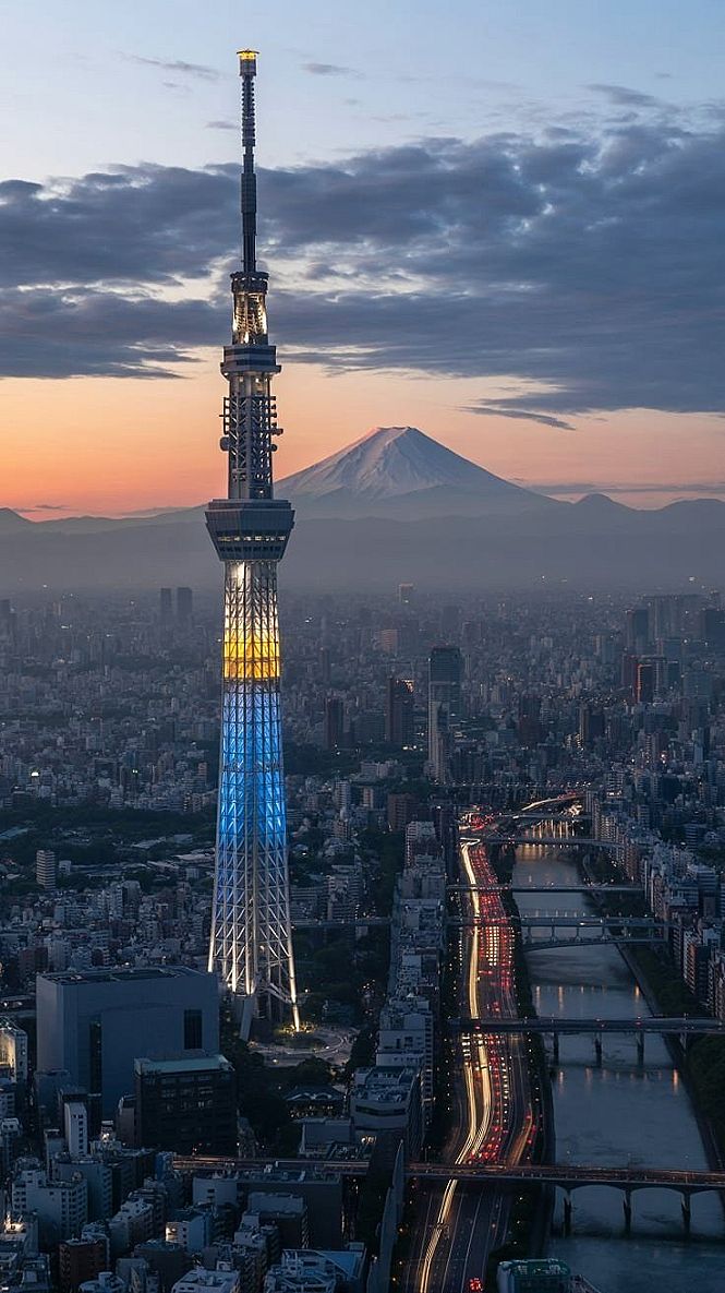 Witness the breathtaking Japanese City Landscape of Tokyo as twilight paints the sky, featuring the iconic Skytree and distant Mount Fuji. This stunning japan photography captures a quintessential photo tokyo moment.