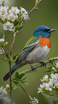 This little dude clearly got the memo that spring is the time to show off! Check out his sweet color coordination with the blossoms – it’s like he raided a rainbow factory and decided to wear every awesome shade at once. I bet he’s off to a party with his bird buddies right after this photoshoot.