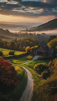 This picture makes me want to grab a backpack and a good book and just disappear for a while. Imagine waking up in that cabin, surrounded by rolling hills and misty forests. It looks like the perfect place to escape the hustle and bustle of everyday life, and just relax. Maybe you could even take a walk down the winding path and see where it leads!