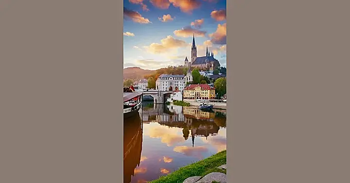 This picture is like a postcard from a fairytale! Look at those beautiful, colorful buildings and the church with its tall, pointy towers. It’s almost like it was lifted straight from a storybook. And then you see the river, acting like a giant mirror, reflecting the sky and the buildings. It’s so cool how the fluffy clouds in the sky look like they are floating right on the water. Makes you want to jump into a boat and sail right into that picture, doesn’t it?