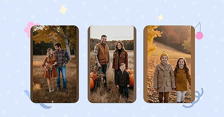 This family is ready for fall! The mom is rocking a gorgeous rust-colored dress that’s practically begging for a pumpkin spice latte. Dad’s looking sharp in his brown jacket, and little brother is all about those fall leaves. They’re all sporting those warm, cozy colors that just scream “autumn” and “pumpkin pie,” which makes you want to grab a warm blanket and settle in for a movie marathon.