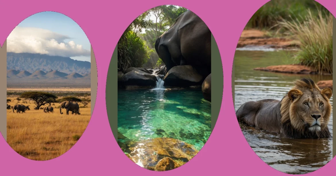 Check out this incredible scene straight out of an Africa nature photography dream! You’ve got this dazzling, turquoise water looking so inviting, with sunlight dappling through the lush jungle canopy and a sweet little waterfall doing its thing. It’s the kind of place where you expect to find exotic birds or maybe a mischievous monkey, but then you spot the real VIP of this hidden oasis: a gigantic elephant just casually hanging out. It looks like he found the ultimate secret spa day spot, probably thinking, “Don’t mind me, just hydrating!”
