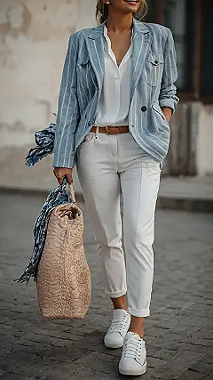 Who says you can’t be super stylish while munching on sandwiches in the park? This look totally nails it with that cool striped blazer and crisp white pants. Those comfy sneakers are practically begging for a spontaneous game of frisbee (or at least quick escape from a runaway soccer ball). It’s an outfit that screams, “I’m here for the fun, but also, please don’t spill the potato salad on me!” You’ll need some serious napkin-wielding skills to keep those bright white pants pristine, unless you’re planning to turn them into a green abstract art piece.