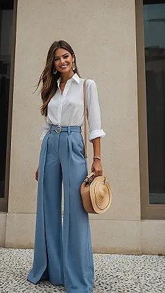 This outfit is basically living proof that you can look super put-together without feeling like you’re stuck in a straightjacket. Check out those amazing wide-leg pants! They look so comfy, you could probably do a full dance routine in them, or at least sneak in an extra-large breakfast burrito without anyone noticing. Paired with that crisp white shirt, it’s like the perfect combo of “I mean business” and “I’m also ready for a nap.” It’s the kind of everyday fashion outfit that says, “Yes, I know what I’m doing, and no, I’m not sacrificing comfort for it.”