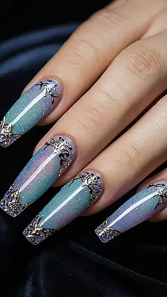 Whoa, check out these nails! It looks like a whole magical forest got turned into a shimmering, sparkly manicure. See that cool glowy streak running down the middle of each nail? That’s the awesome ‘Cat Eye’ effect, making them look like a secret portal to another dimension, or maybe just a super chic cat decided to wink at your fingertips. The colors morph from a dreamy lavender haze to a sparkling aqua ocean, giving off serious mermaid-meets-mystical-feline vibes. You’d definitely be able to spot these sparkling from a mile away!