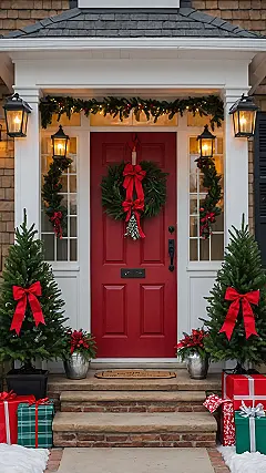 Right in the middle of all this festive glory, the front door totally steals the show with its super classic wreath, rocking a giant, cheerful red bow. It’s like the door is wearing a party hat, welcoming everyone with a big festive grin! And check out those two mini Christmas trees in their elegant pots, standing guard like tiny, adorable holiday sentinels, probably whispering secrets about who’s been naughty or nice. This outdoor setup definitely proves that even when it’s freezing outside, your house can still bring all the warm, cozy, and totally photogenic holiday vibes!