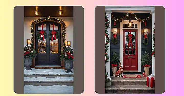 This snowy scene makes you want to grab a hot chocolate and just stare at all the festive cheer! Those big, beautiful wreaths hanging on the doors look like they’re giving everyone a giant, green hug, complete with flashy red bows that practically scream, “Welcome, holiday season!” And check out the garland twinkling with lights – it’s probably working overtime trying to melt the snow off the steps, but let’s be real, it’s just adding to the magical glow. You can almost hear the door whispering, “Come on in, it’s warm inside, and we’ve got cookies!”