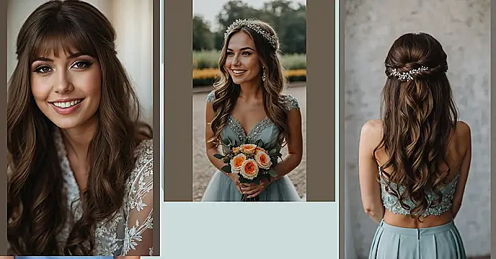 Check out this hairstyle! It’s basically the hair equivalent of having your cake and eating it too. It’s got those gorgeous waves flowing free, but the top half is cleverly pulled back, keeping it tidy and showing off your lovely face. Plus, adding a sparkly clip like the one here? Chef’s kiss! It just elevates the whole look without being too over-the-top. This kind of half-up, half-down vibe is perfect for bridesmaids because it looks elegant, stays mostly put, and lets you focus on supporting the bride and, you know, grabbing snacks without your hair ending up in them.