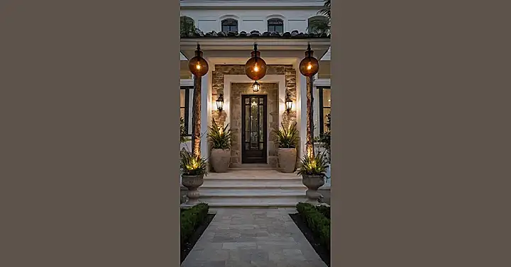 As December rolls around, bringing with it days shorter than your attention span during a history lecture, good outdoor lighting becomes less a fancy upgrade and more a survival necessity. This amazing entrance totally gets it! Those giant, glowing amber orbs hanging from the ceiling aren’t just there to look super cool (though they absolutely do); they’re basically saying, “Welcome, friend, and please don’t face-plant on our beautiful steps in the dark.” With all these warm lights, you might even forget it’s practically freezing outside for a second, feeling like you’ve stepped into a cozy, illuminated wonderland.