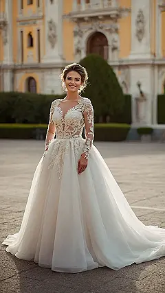 This dress looks like it was made for a secret garden wedding! Imagine walking down the aisle, sunlight streaming through the trees, and feeling like an absolute princess. The lacy sleeves are super cute, perfect for a summer breeze, and the whole vibe is just totally dreamy. Just try not to trip over the train while you’re busy looking amazing!