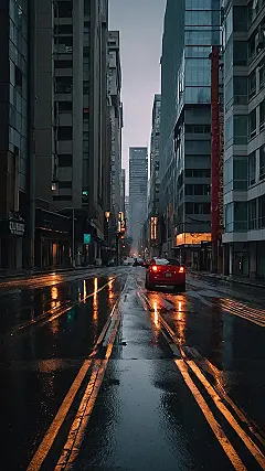 This picture shows a cool city street that looks super stylish, even though it’s raining. It’s like a scene straight out of a movie! All the buildings are tall and sleek, creating a narrow alleyway that makes you feel like you’re walking through a mysterious and exciting place. The rain adds to the atmosphere, making the wet pavement reflect the lights like a giant mirror, making it even more eye-catching. It’s the kind of place where you can imagine a cool car like the red one in the photo speeding through, maybe on its way to a fancy event or a secret mission.
