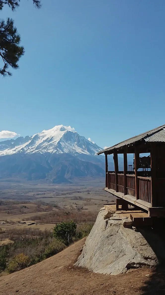This picture is like a postcard from a super cool place! It’s got this little wooden cabin perched on a rocky cliff, and you can see a huge mountain in the distance. Imagine sitting on the porch with a hot drink, watching the clouds drift by. The mountain looks kind of like a giant ice cream cone, with a white, snowy top and brown, rocky sides. You’d probably want to pack a good book and maybe some snacks to enjoy the view. It’s the kind of place where you could relax and forget about all your worries, just chill and appreciate the beauty of nature.